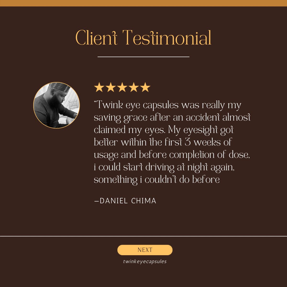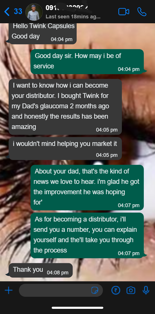 I can’t thank you enough! For years, my eyesight kept getting worse—reading was a struggle, and night driving was not possible. I almost lost my vision completely. But after using Twink Eye Capsules for a few weeks, my eyes felt a lot relieved, I could read better, and driving at night became much easier. Two months so far, my vision is clearer, and my life is better for it. Twink is truly a lifesaver!