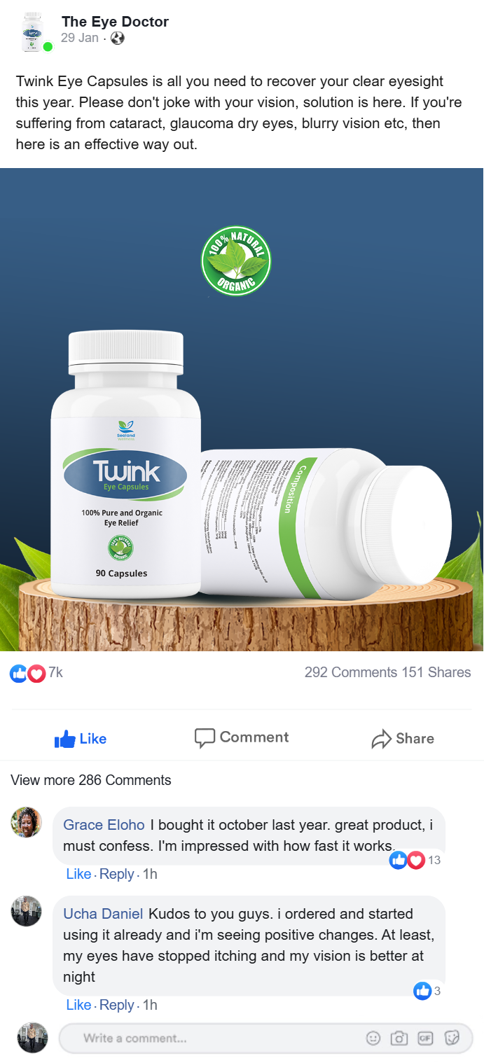 If you have eye challenges, Twink Eye Capsules is 100% worth the trial, you will be amazed at how fast your vision gets better within a couple of days.